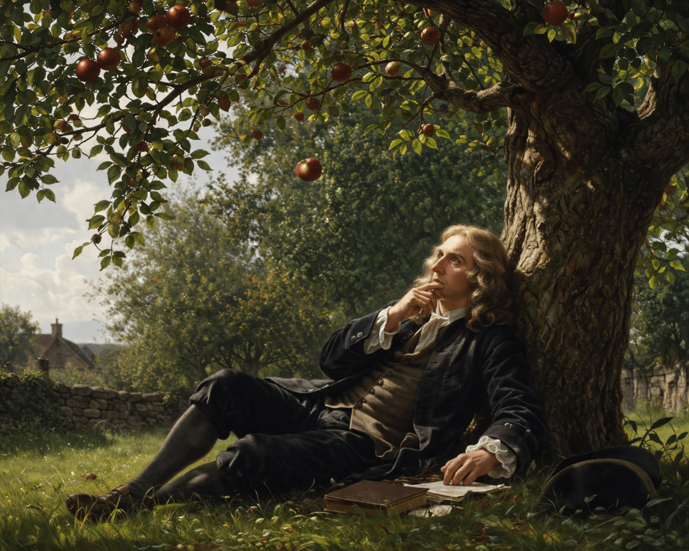 “Im Sommer 1665 legt sich Isaac Newton  im Garten seines Elternhauses in Woolthorpe nahe Cambridge unter einen Apfelbaum. Vermutlich ist ein schöner Sommertag, vermutlich weht ein leichtes Lüftchen. Auf irgendeine Art und Weise jedenfalls löst sich ein Apfel der Sorte “Flower of Kent” vom Ast und fällt zu Boden. So wird es der inzwischen berühmteweiter ….15. April 1726 – Die Geschichte von Newtons Apfel entsteht.
