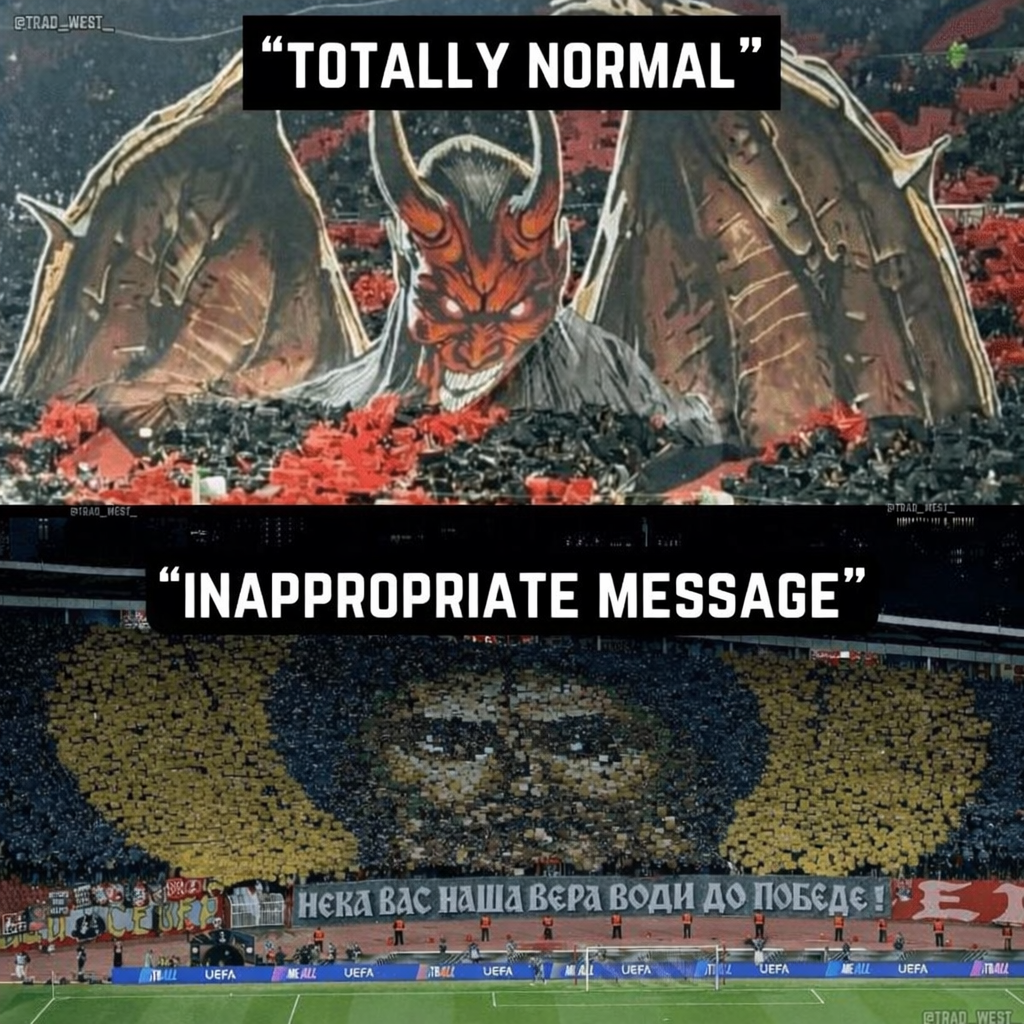 Beides so tatsächlich passiert in Fussballstadien. Das eine ist total normal und das andere eine “unangemessene Botschaft”, die sogar bestraft wurde. Die UEFA hat Crvena Zvezda (FK RoterStern Belgrad) wegen dieser Choreografie (unten) mit einer Geldstrafe von 95.500 € belegt! Der größte Teil der € wurde verhängt, weil angeblich „eineweiter ….Beides so tatsächlich passiert in Fussballstadien