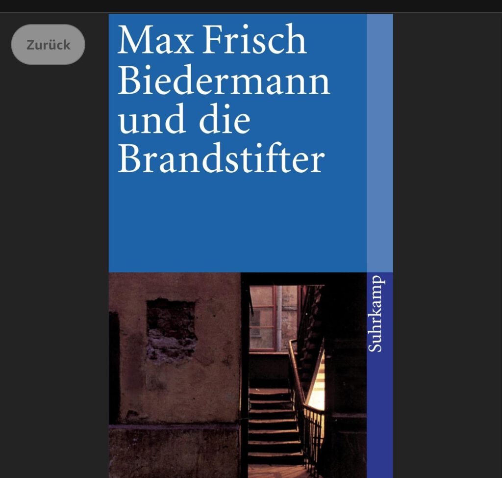 In dem Buch “ Biedermann und die Brandstifter“ geht es um einen Mann namens Biedermann, der einen Brandstifter in sein Haus aufnimmt, der sich als Hausierer ausgibt. Es gab eine Welle von Brandstifterei in der Gegend. Biedermann spielt den Menschenfreund.