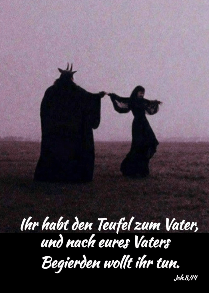 Ihr habt den Teufel zum Vater, und was euer Vater begehrt, wollt ihr tun! Der war ein Menschenmörder von Anfang an und steht nicht in der Wahrheit, denn Wahrheit ist nicht in ihm. Wenn er die Lüge redet, so redet er aus seinem Eigenen, denn er ist ein Lügner und der Vater derselben.