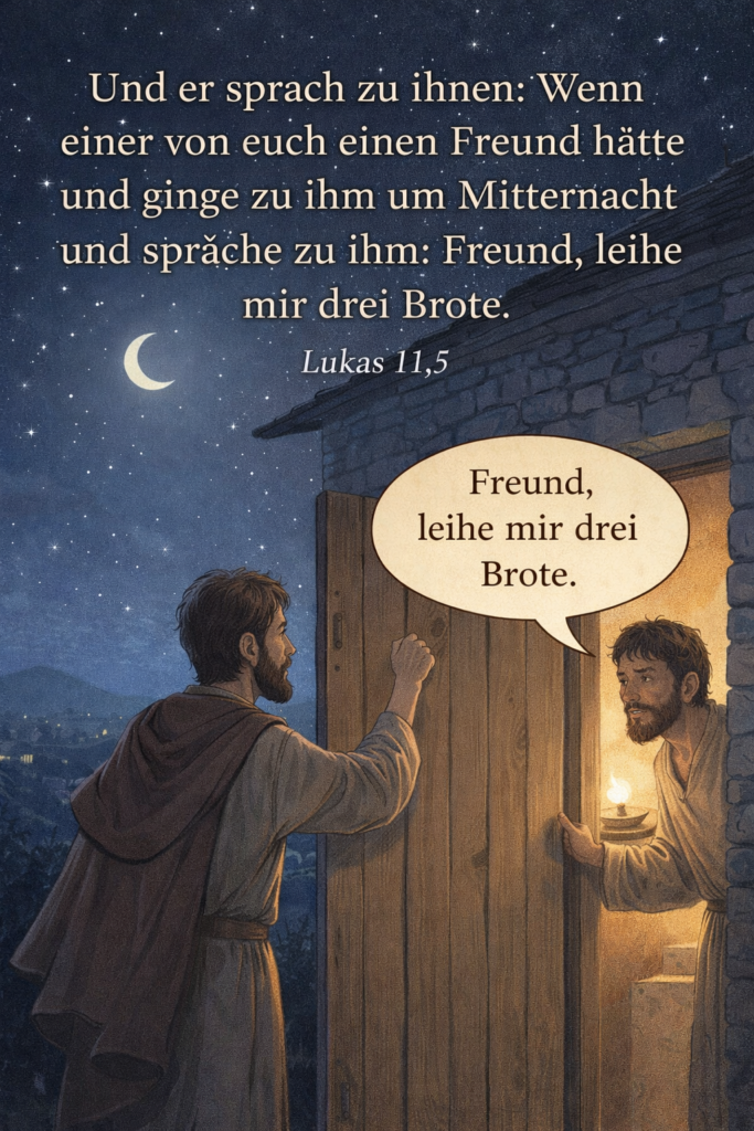 Und er sprach zu ihnen: Wenn einer von euch einen Freund hätte und ginge zu ihm um Mitternacht und spräche zu ihm: Freund, leihe mir drei Brote,